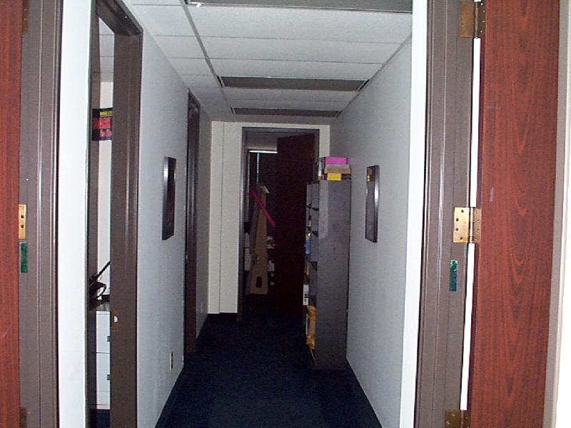 This is a hallway in our offices. To your left are two doors. The first leads to Paul Schuytema's Office. To your right is the office of Frank Maddin.
