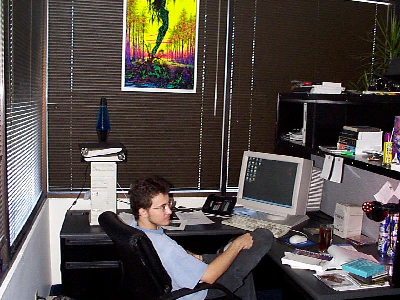 The blue lava lamp is usually on, creaing a very eerie mood when Tom is the only one working at the office.