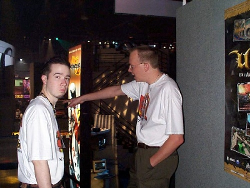 "While the photo might look otherwise, Keith is actually NOT point at something off camera, but is pointing at a freakishly large wart on Chris's neck, which is in the shape of the Dopefish. This, of course, means Chris is the annointed Messiah of the Dopefish (sorry Joe) and must smite down George and allow the Mighty Fish to be in DNF!!" (Draco)