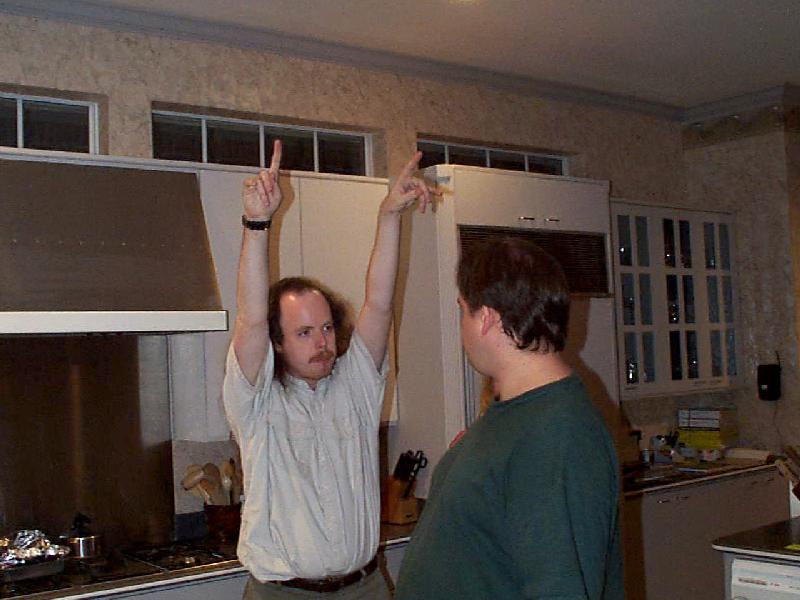 gesticulating to Joe Siegler in the kitchen at Tom's house.