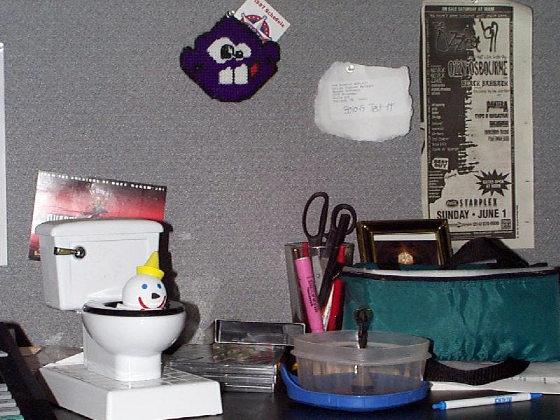 littered with office supplies and a small toilet. There are exits to the East and South.