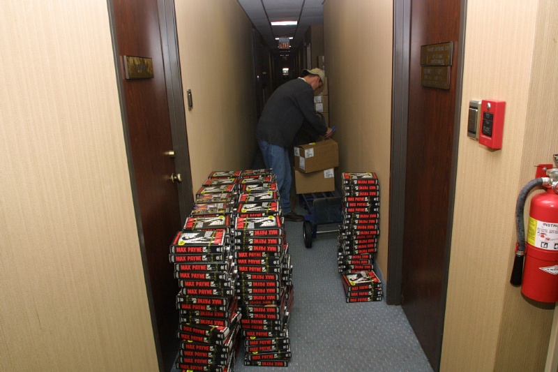 boxes in the building hallway at 5AM the day we shipped Max Payne.