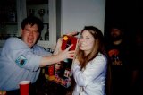 sister Michelle as she swipes his lava lamp at a company Christmas party