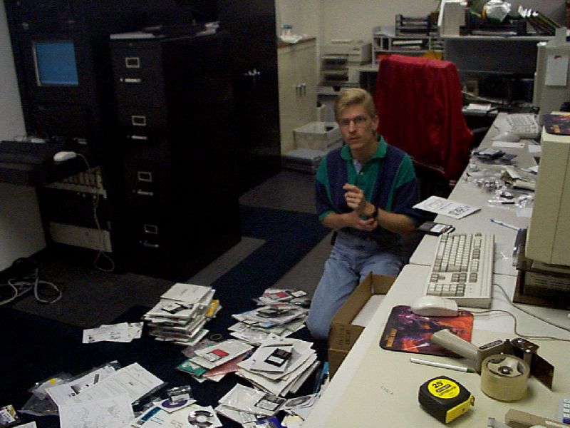 of computer software & manuals on the floor. No one remembers exactly why.