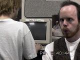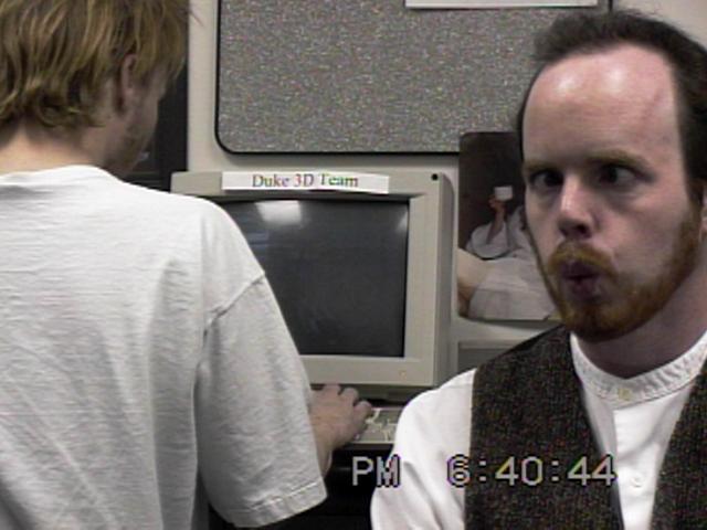 for the camera, with Todd Replogle coding Duke3D on his right.