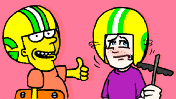 kid wearing a huge, yellow football helmet comes bouncing in on a pogo
