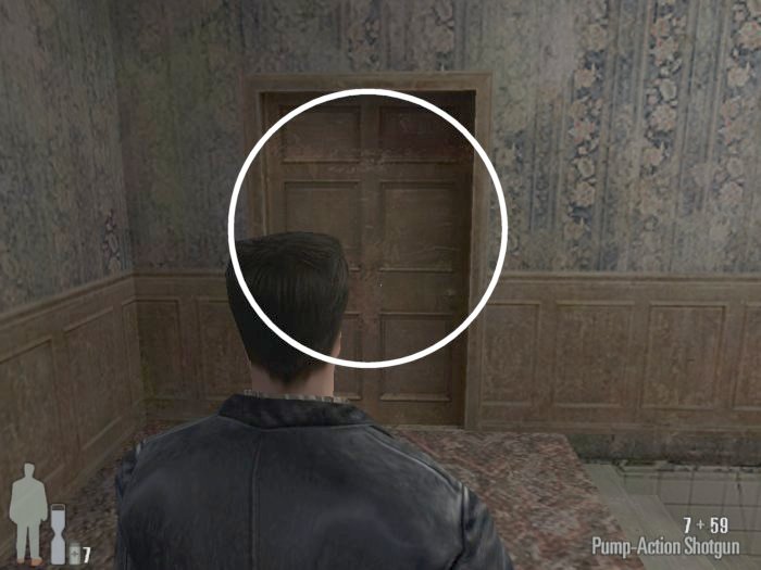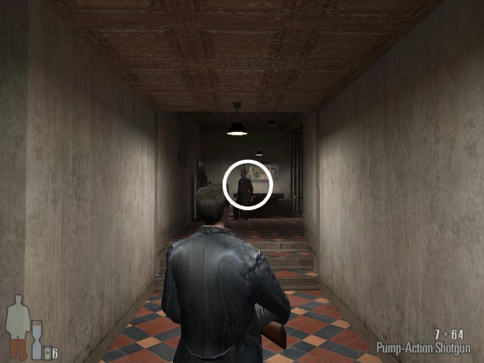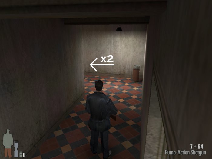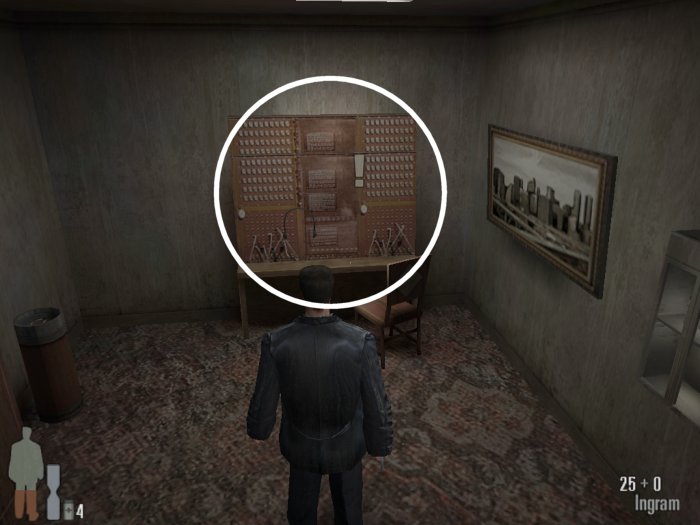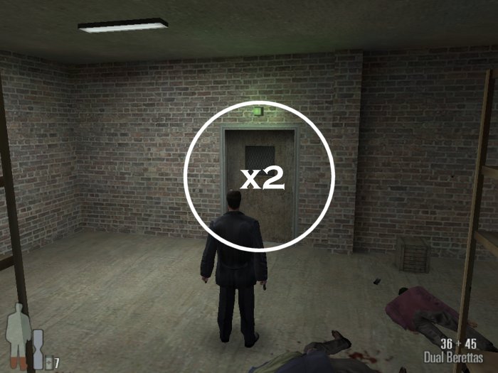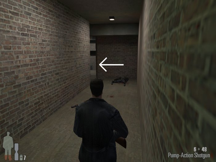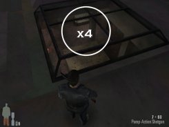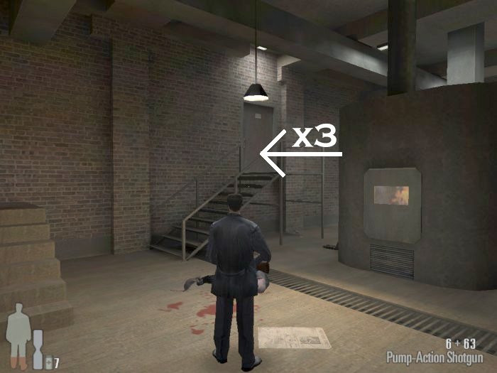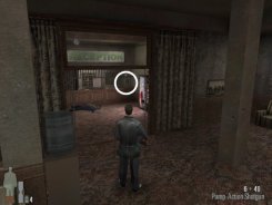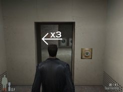 Then exit that room to the roof and blast the glass to fall into the next room. There are four thugs in that room. Then go the reception area and hit the exit button.