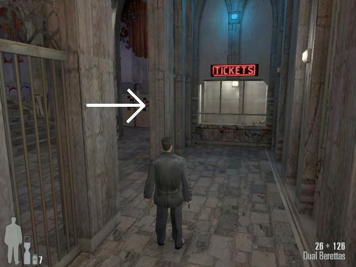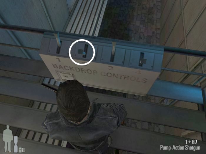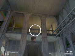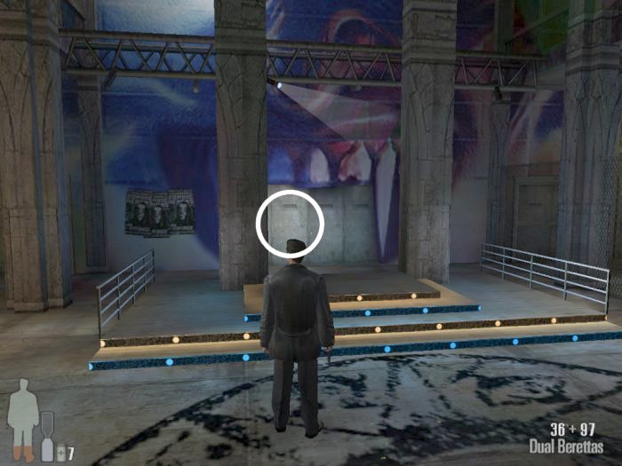 At the top of the stairs there will a door. Through the door and to the left will be a goon, there is a second one across the way on the other balcony. Head through the doors at the end of the balcony, the second set after that will open onto the a huge overhead seating area and there will be two more thugs to the right as you enter.