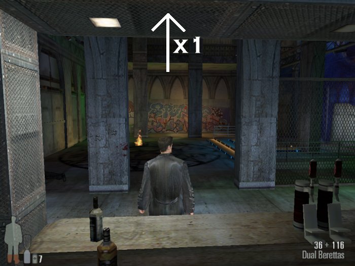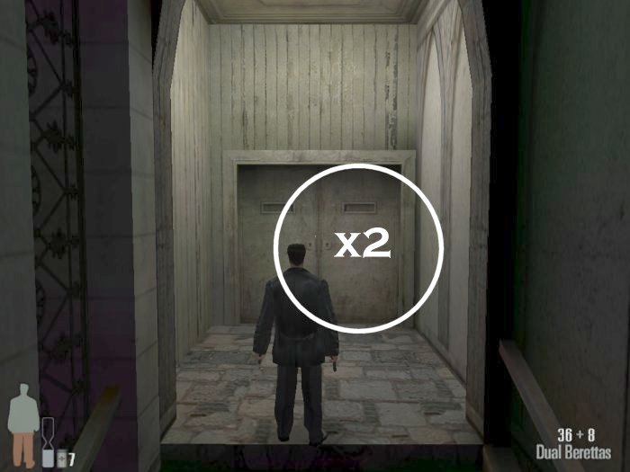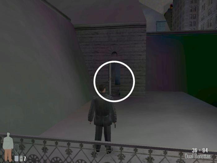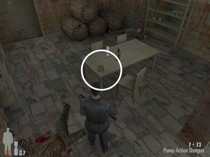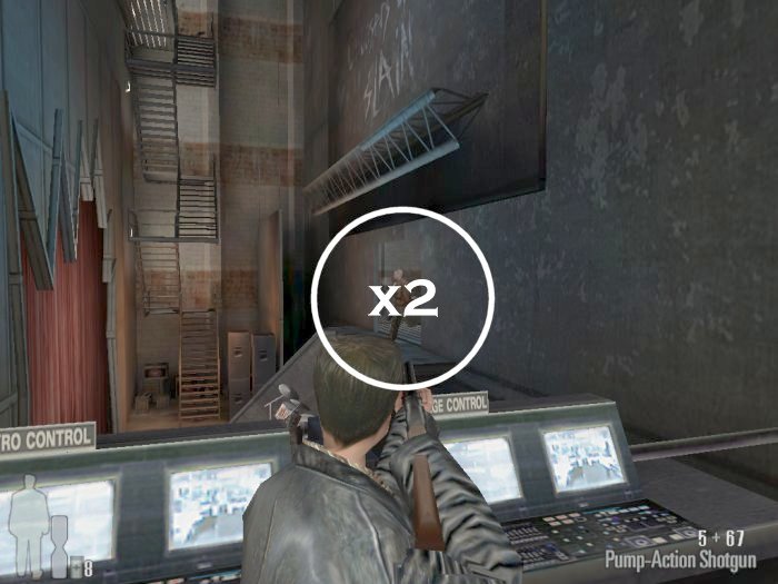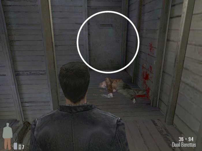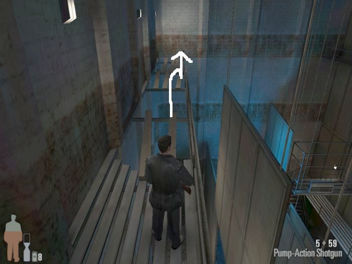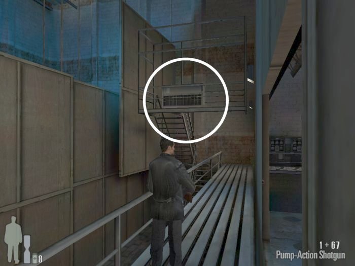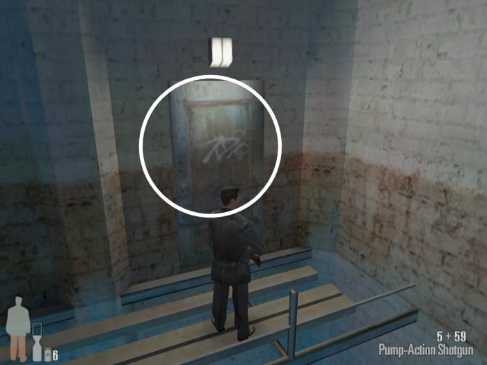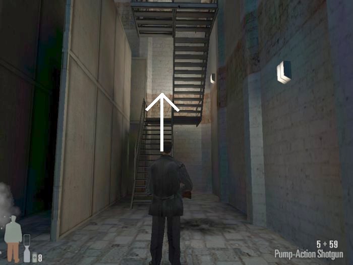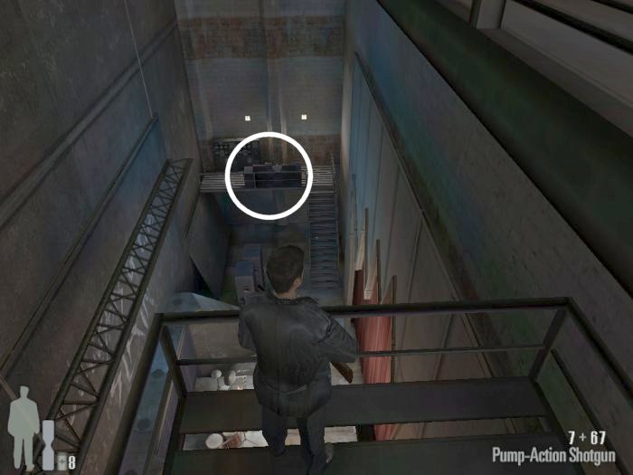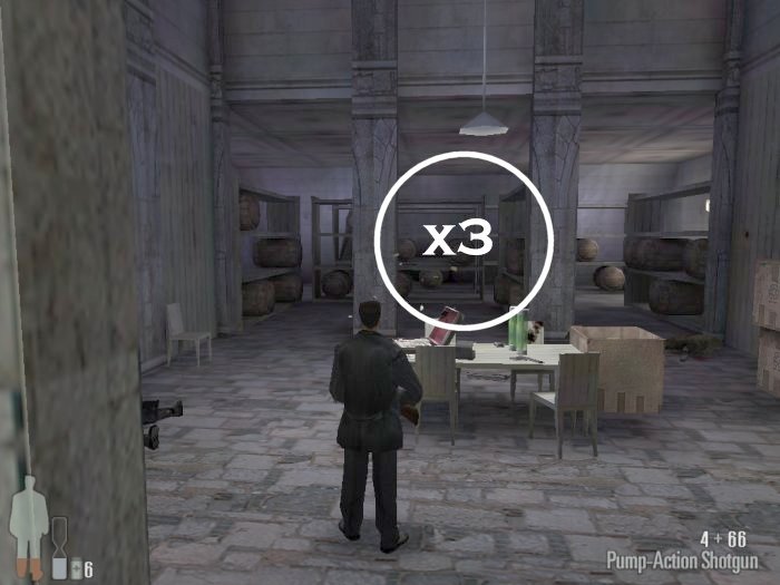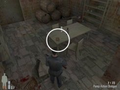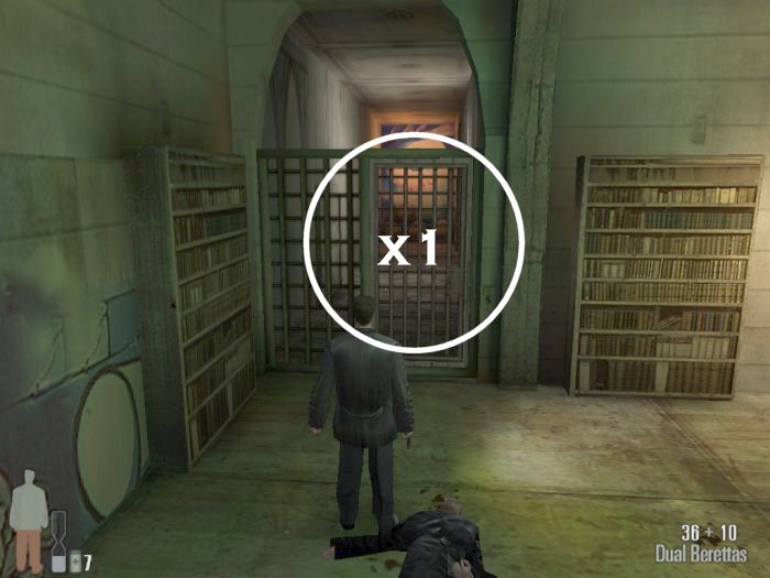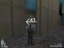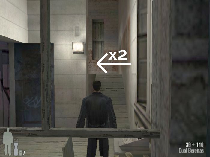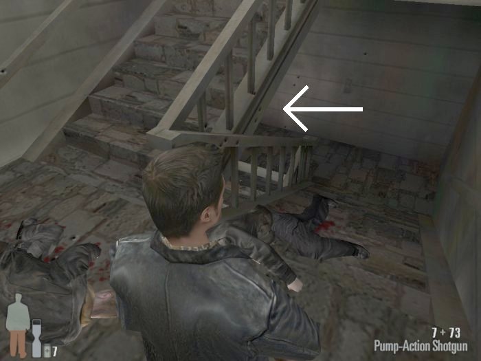 As you enter the small hall a guy with a shotgun will come from the left. Take him out. There are two more guys on the stairs. Also be careful of the trap door. At the top of the stairs there'll be one or two more bad guys depending on your ability to get the previous mobsters before they retreat.