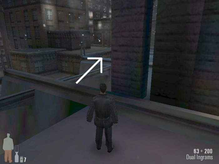 Head carefully on the ledges to the next building. As you enter the building you'll come across 3 goons coming up the stairs.