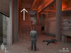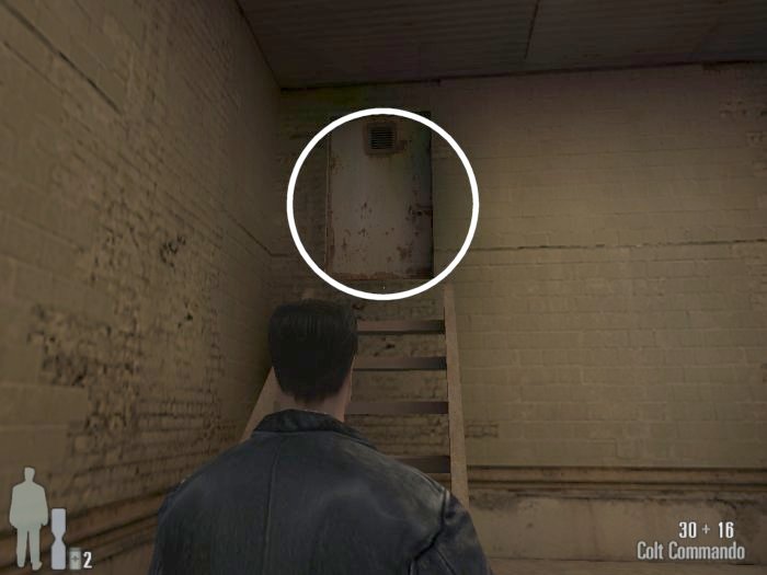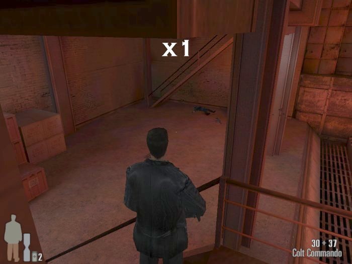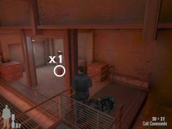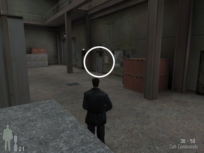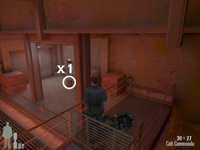 The next major room has 3 guard. One on a platform to your left and two across the way. Once they are dead head to the small platform to your left as you entered. Once up there turn to face the door you entered through as a guard will come in after you. Just blow the barrel to take care of him. Then cross the gap using the pipes. Once on the other side another guard will come down the stairs. Head up the stairs.