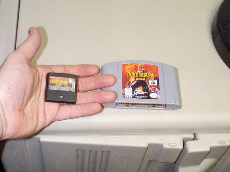 We've been told that the TigerToys version of Duke Nukem 3D is now in stores. The game.com system is a small hand held gaming unit. The cartridges for this unit are fairly small. As an example, see the actual game.com Duke3D cartridge next to the cartridge for Duke Nukem 64 below!