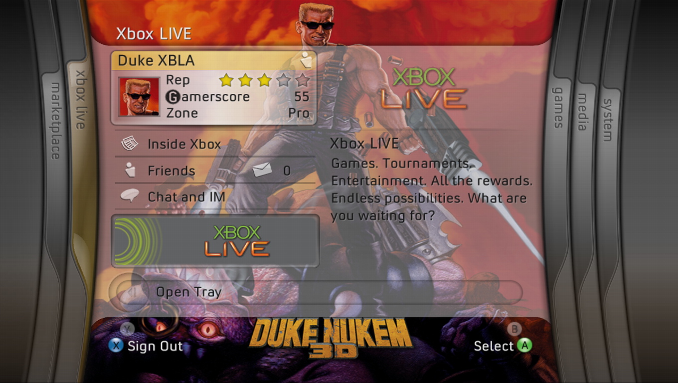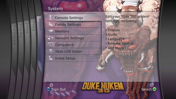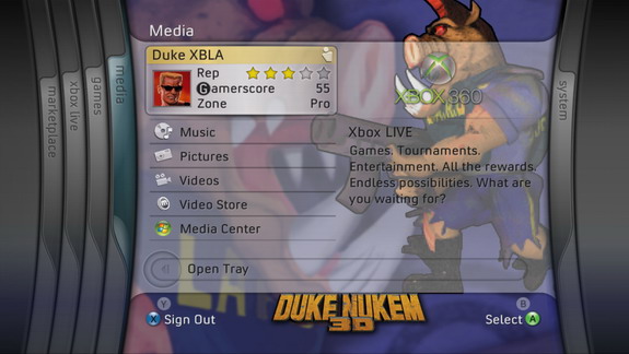 As we noted yesterday, other items were released besides Duke Nukem 3D itself on Xbox LIVE Arcade. We also released some gamer pic packs and a theme. We've had several requests for pictures showing what the theme looks like. This news item is an answer to those requests.