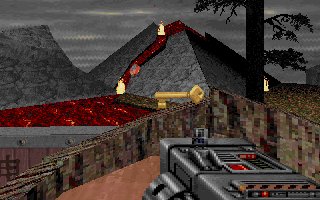 large door that is locked with the red key. Unlock it and open it. Walk around the lava on
