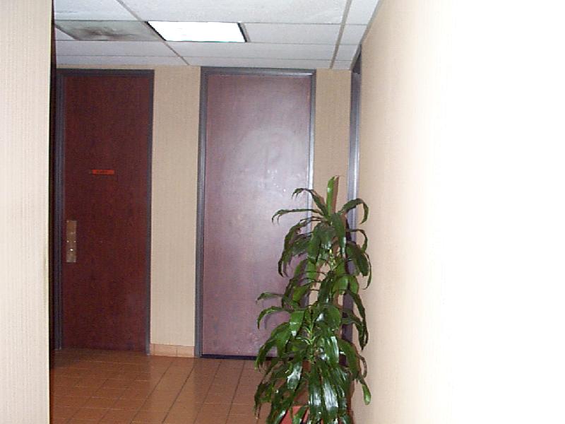 This is one of the corridors in our office building. Ahead of you, you can see two doors. The one on the left is a