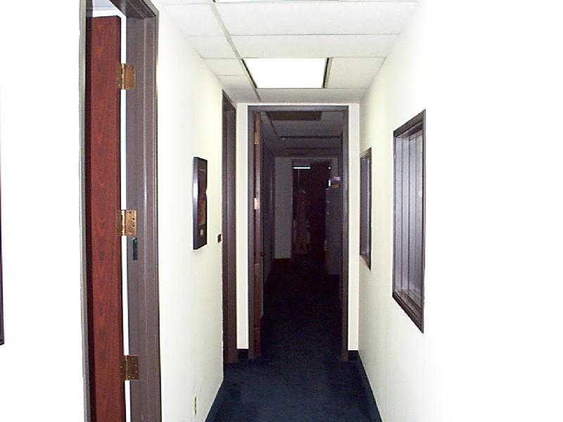 This is a hallway in our offices. To your left is Colleen Compton's Office. To your right is a window that normally would let you see into Tech Support, but it's blocked by a desk.