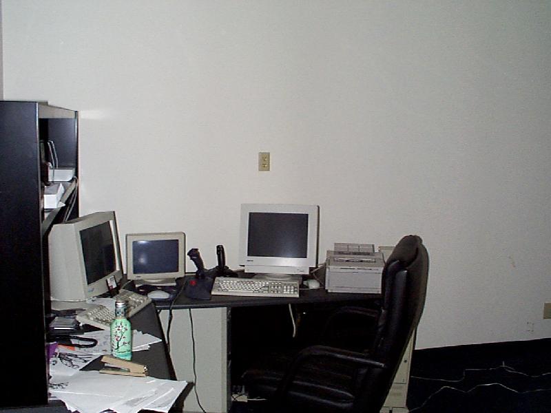 Frank is obviously not here. He either is off giving someone the Frank Spank, or he's in the bathroom from the iced tea you can see on his desk.