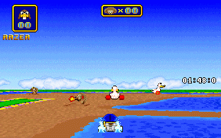 You can play any of eight wacky animals in Wacky Wheels. Each animal has its own colorful