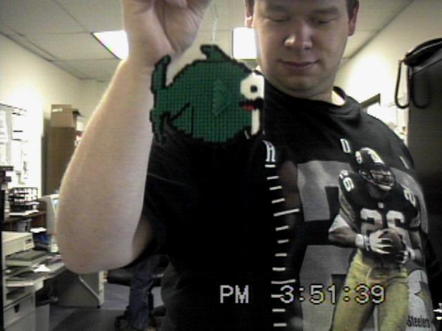in front of the Live Shot Camera holding a Dopefish Christmas Tree Ornament.