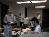 A frantic effort is in progress to find all the CDs which contains the naked GIF file of George Broussard and was accidentally inserted and copied somewhere in the duplication process. The guilty party (looking at the camera) is identified by the pointing man in the background, the desk jockey who is trying to hide his disgust while opening a bottle of Valium, and the exasperated worker looking at several more stacks of CDs. (Jack Lee)