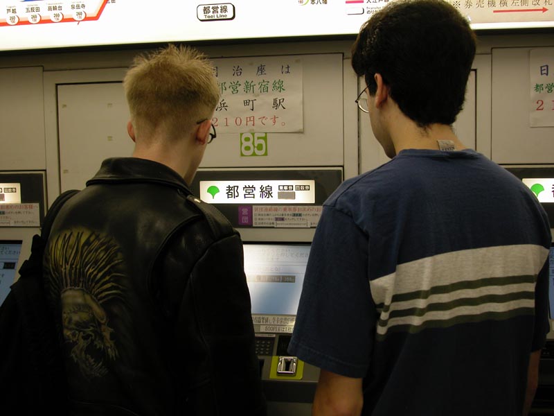 Kyle Davis trying to figure out how to work a ticket machine in the Subway system