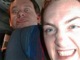 3D Realms' Joe Siegler, giddy from a testosterone high after snapping pictures of countless booth babes at E3, reaches around an airplane seat and grabs Matt Wood where it hurts. Afterwards, he commented, ''I've always been a mildly complacent person. It's time I become more aggressive.'' (David Laprad)