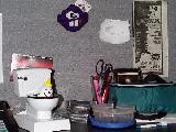littered with office supplies and a small toilet. There are exits to the East and South.