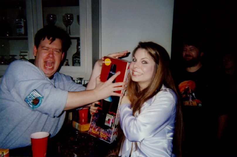 sister Michelle as she swipes his lava lamp at a company Christmas party