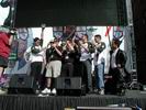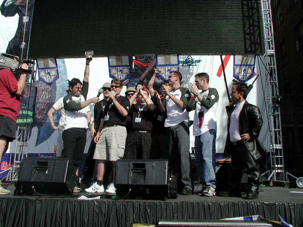 several folks from Remedy Entertainment on stage accepting an award for Max Payne at the Gathering of Developers Promised Lot at E3 2001