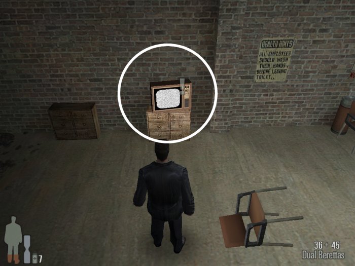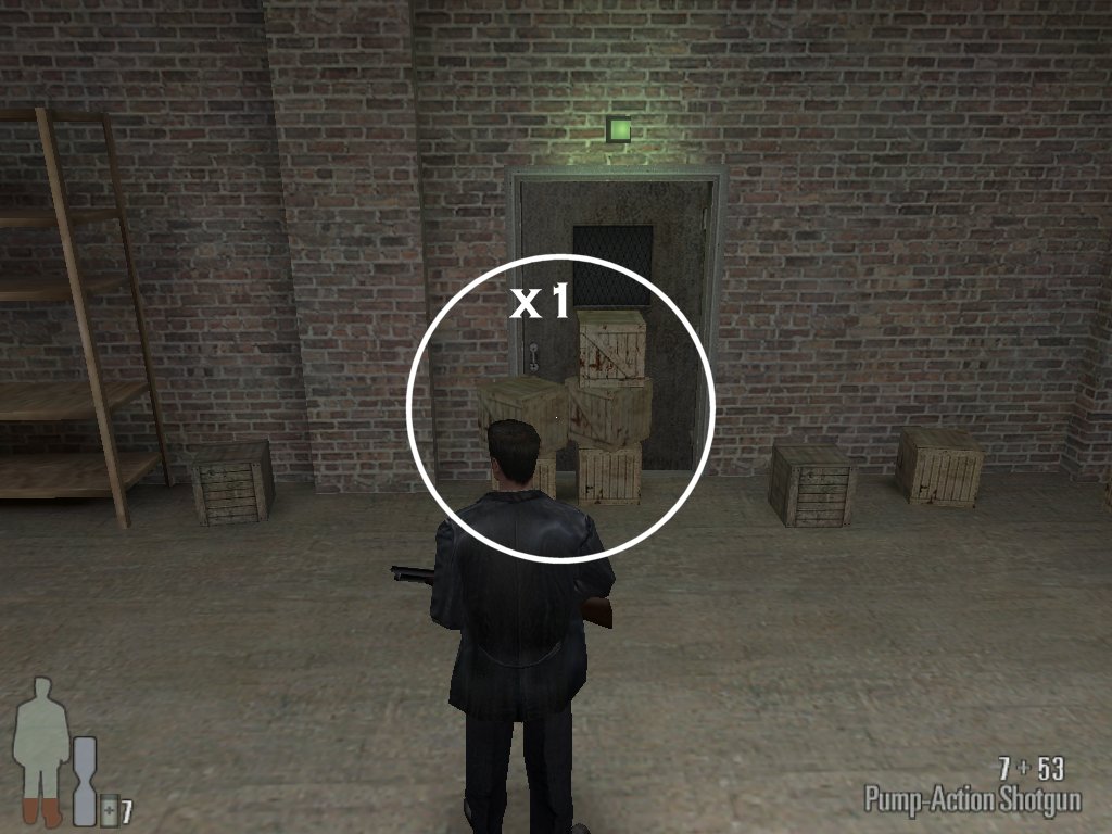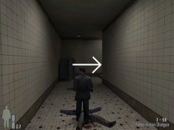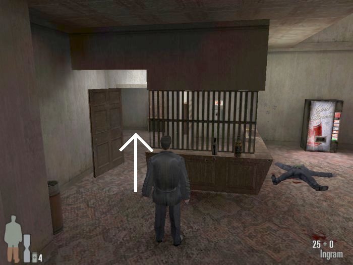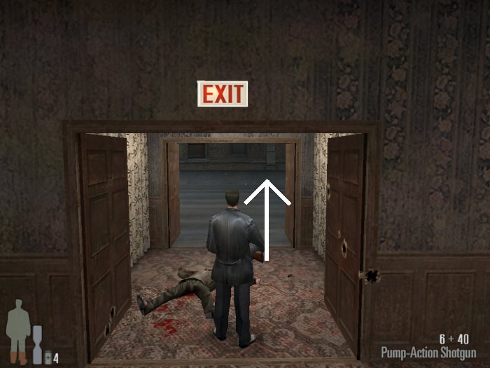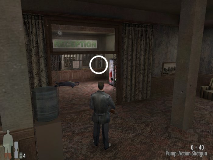 Then exit that room to the roof and blast the glass to fall into the next room. There are four thugs in that room. Then go the reception area and hit the exit button.