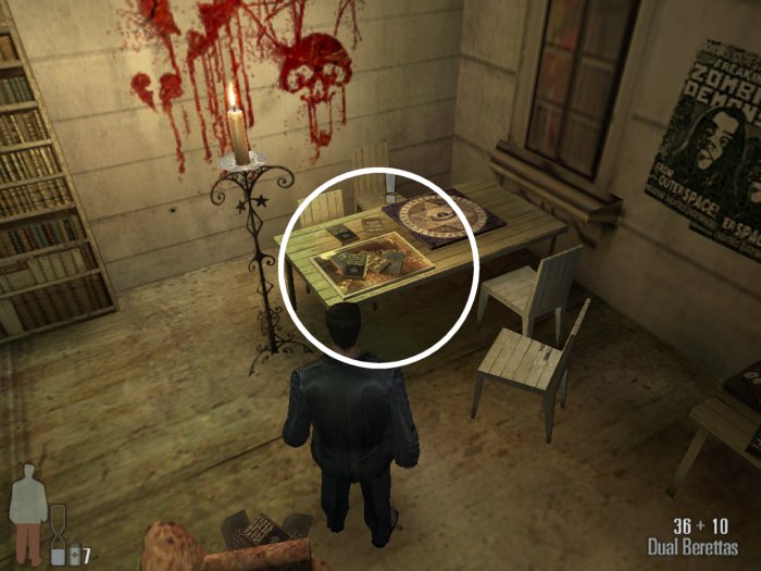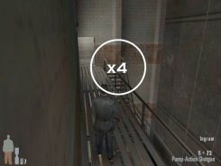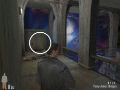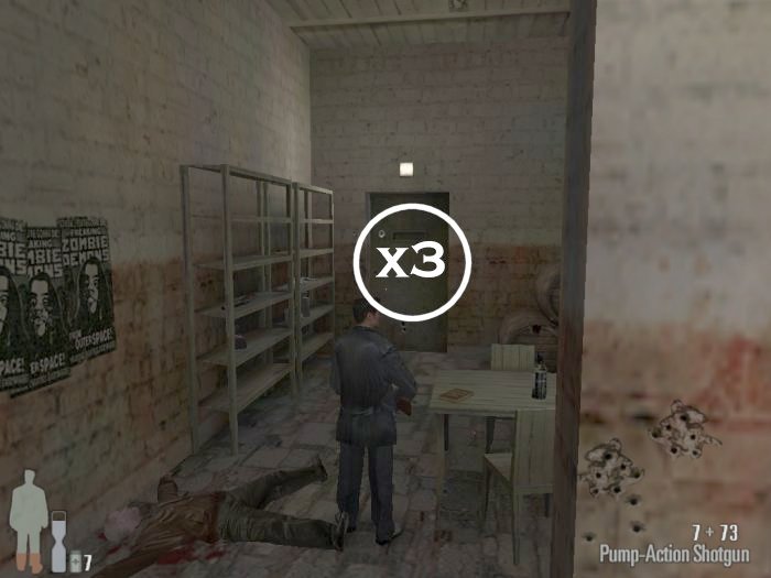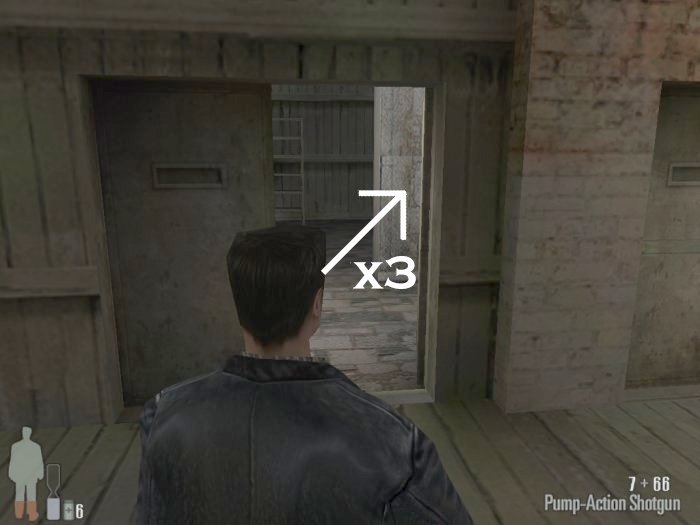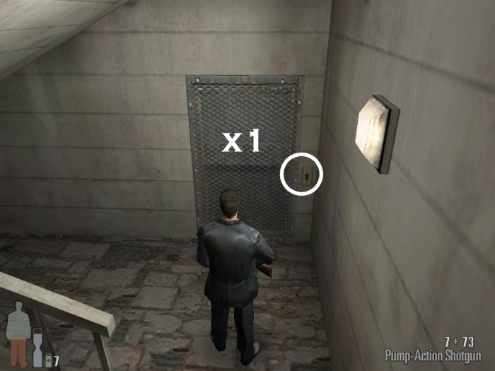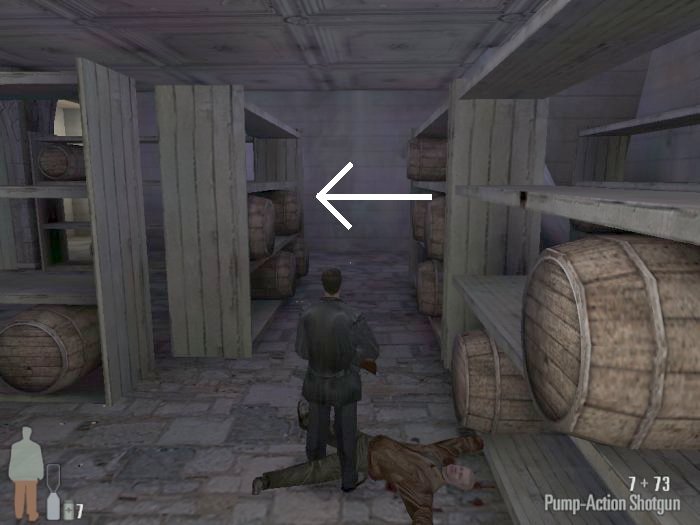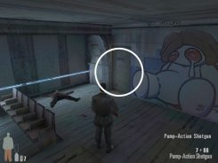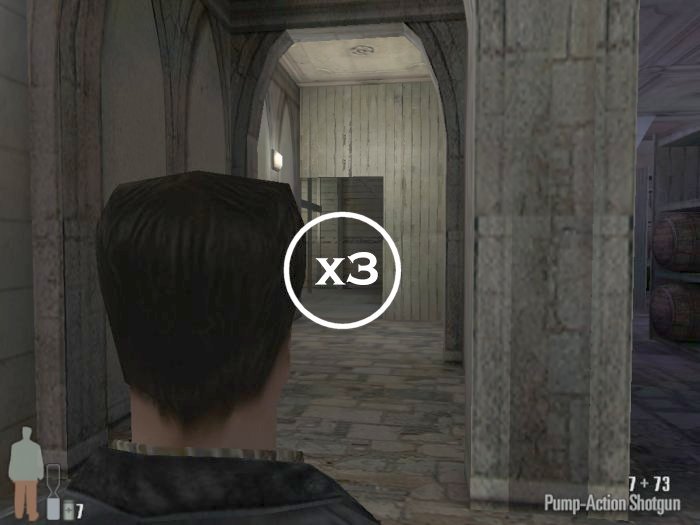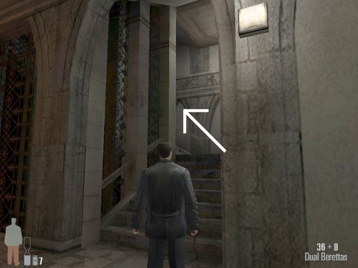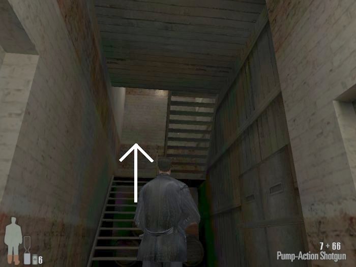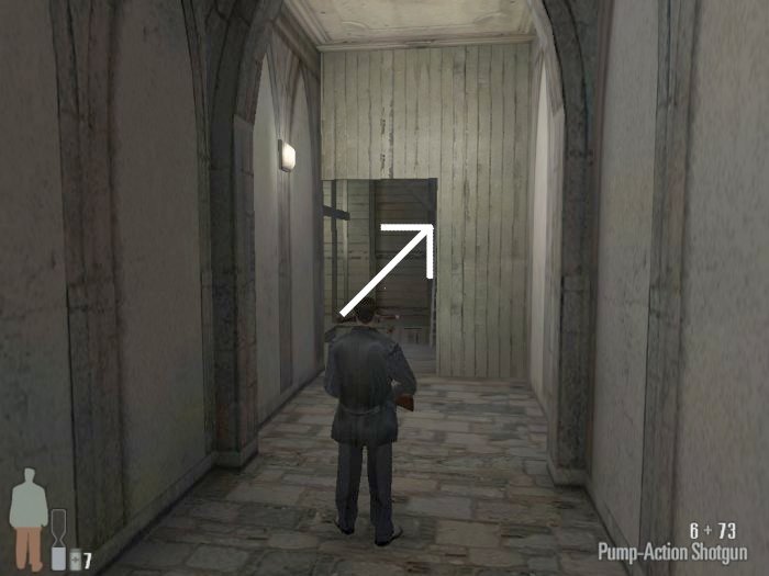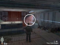 As you enter the small hall a guy with a shotgun will come from the left. Take him out. There are two more guys on the stairs. Also be careful of the trap door. At the top of the stairs there'll be one or two more bad guys depending on your ability to get the previous mobsters before they retreat.