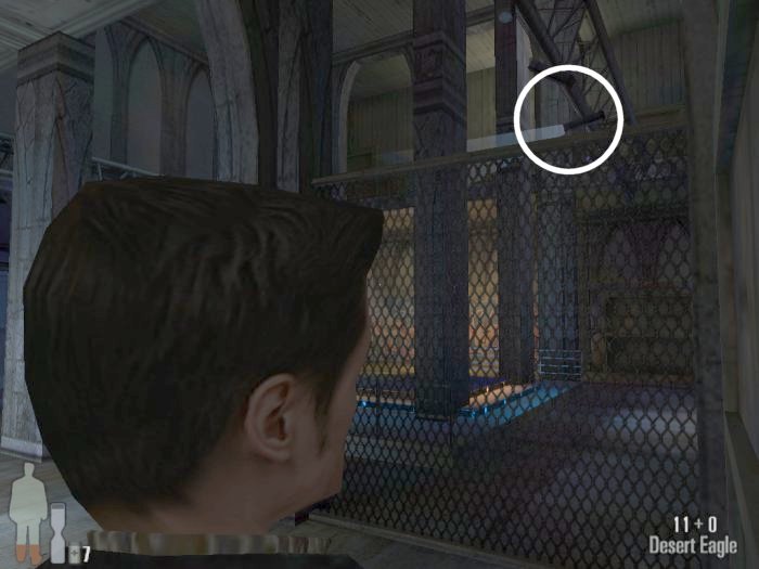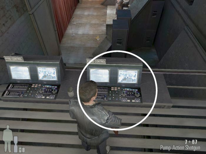 At the top of the stairs there will a door. Through the door and to the left will be a goon, there is a second one across the way on the other balcony. Head through the doors at the end of the balcony, the second set after that will open onto the a huge overhead seating area and there will be two more thugs to the right as you enter.