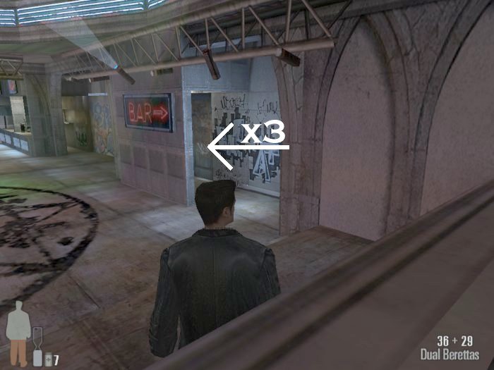 Check out the book and then prepare for your fight. There are 3 guys to worry about on the other end as soon as you enter. A bartender straight in front, a good shotgun blast. One more guy to your left immediately on entering on the ground floor and then a guy on the far balcony.