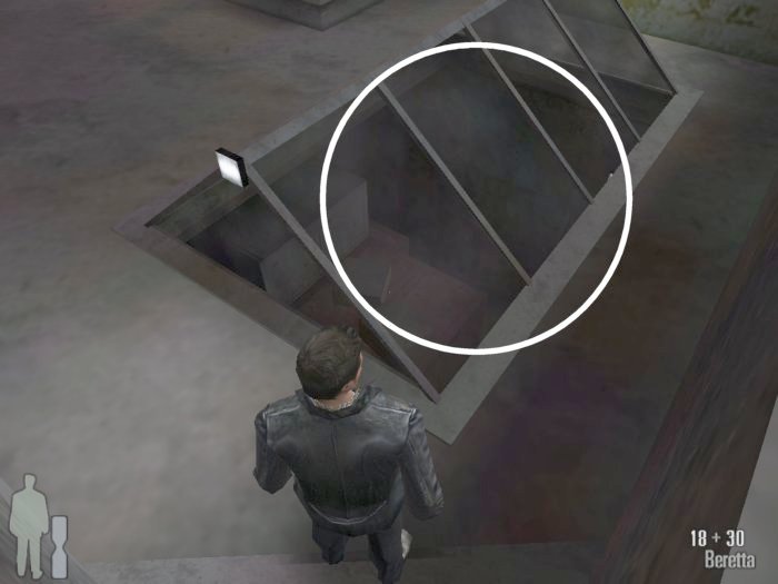 The next major room has 3 guard. One on a platform to your left and two across the way. Once they are dead head to the small platform to your left as you entered. Once up there turn to face the door you entered through as a guard will come in after you. Just blow the barrel to take care of him. Then cross the gap using the pipes. Once on the other side another guard will come down the stairs. Head up the stairs.