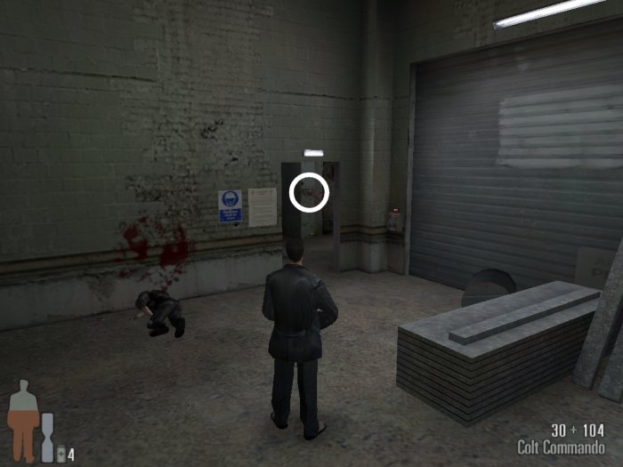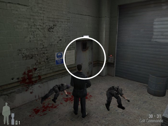 the battle is won head up the stairs and grab the painkillers. Then back down to ground level, over the small platform to the door on the opposite far corner. There are two guards in there working on some trip mines. So just lob a grenade in to take care of both of them.
