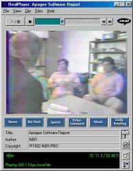 NOTE (May 2005): This was encoded back in 1998 when RealPlayer used a much older and different video codec.  To play this now, I believe you have to install a legacy plugin for the current RealPlayer to read their old format, which doesn't work stock out of the box in their current player.  Real's website should have further information on this.