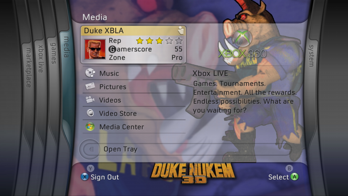 As we noted yesterday, other items were released besides Duke Nukem 3D itself on Xbox LIVE Arcade. We also released some gamer pic packs and a theme. We've had several requests for pictures showing what the theme looks like. This news item is an answer to those requests.