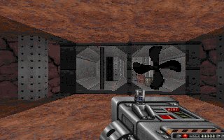 hole in the floor. To the right is a hatch in the wall with a Riot Gun inside. On the