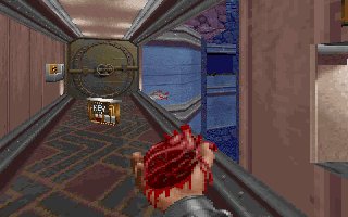 Once you have blasted it apart, go out of this room and up the elevator and head back down