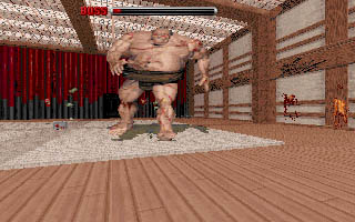 arena where a Sumo boss is waiting for you. Quickly run along the outside of the room,