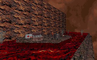 nuclear missile and portable medkit are stashed on a platform in the lava.