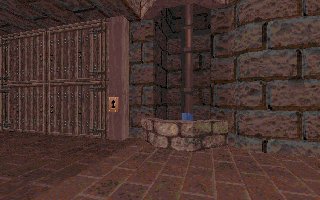 door, there is a well with a drain pipe on the side of the door with the crates. Climb up