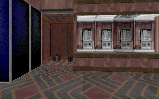notice 4 phone booths and a soda pop machine next to the phones at the end of the hall. If