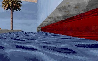 secret area, there is a red van with a palm tree in the corner. There is water behind the