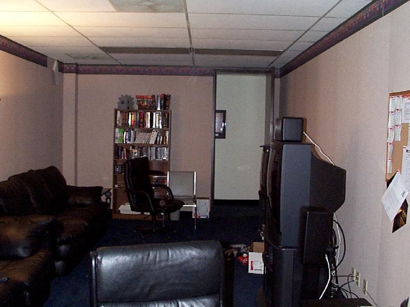 This is our company lounge. In it we have the two large sofas you see, a big screen TV with a DSS Satellite, an Internet